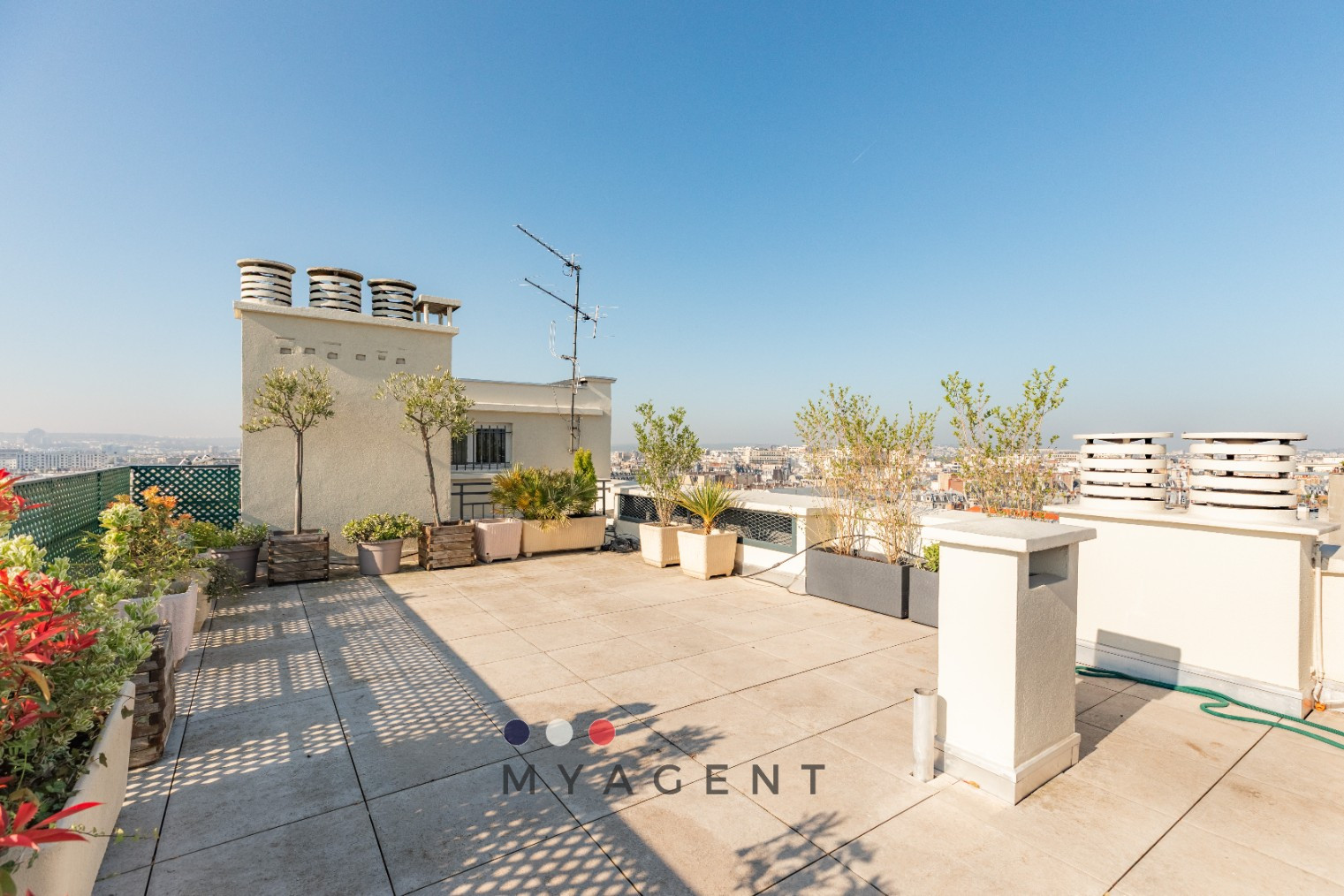 La cerise sur le gâteau : une immense terrasse aménagée, avec vue à presque 360° sur Paris, sans aucun vis-à-vis. Véritable havre de paix au cœur de la capitale.