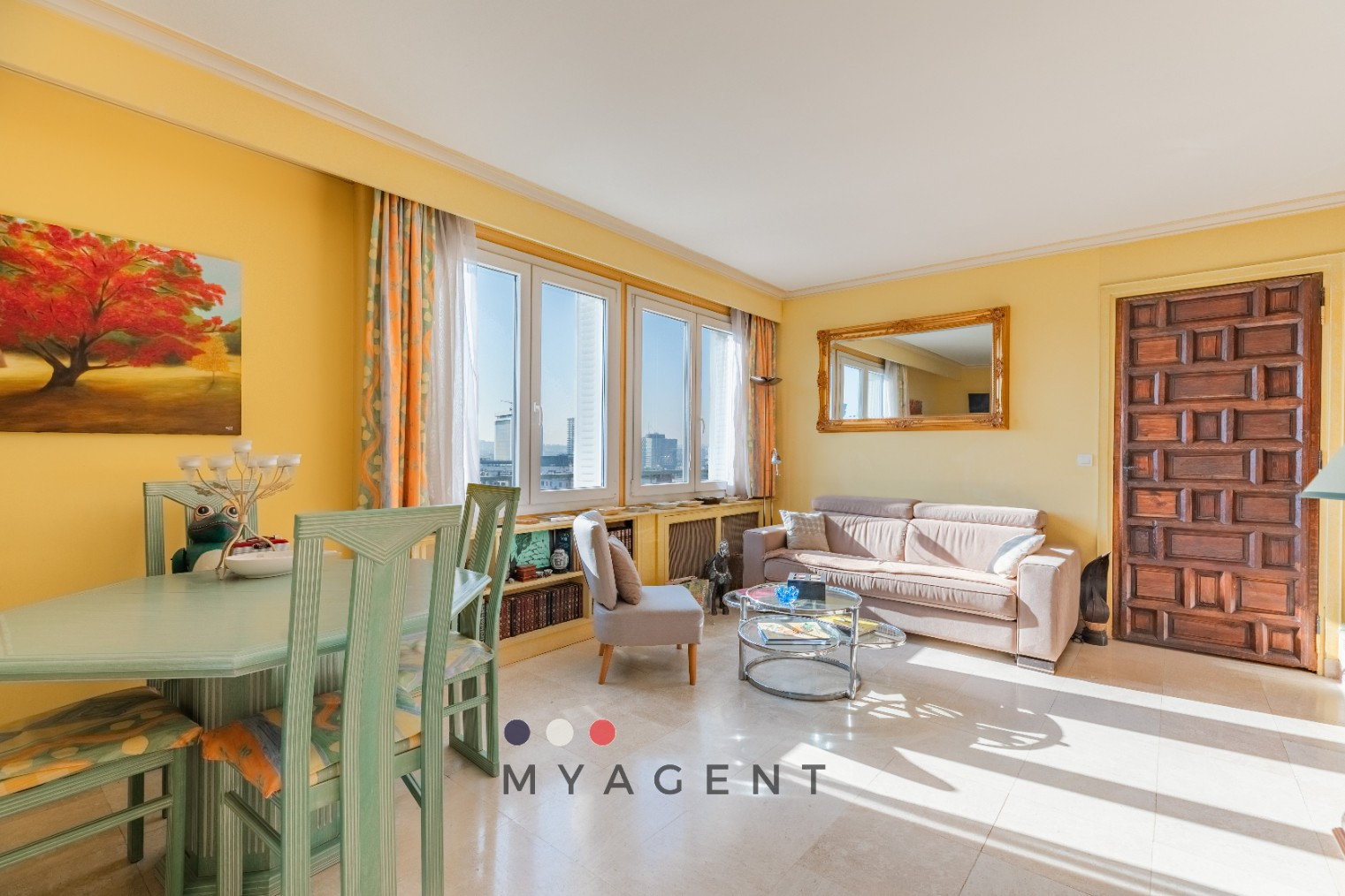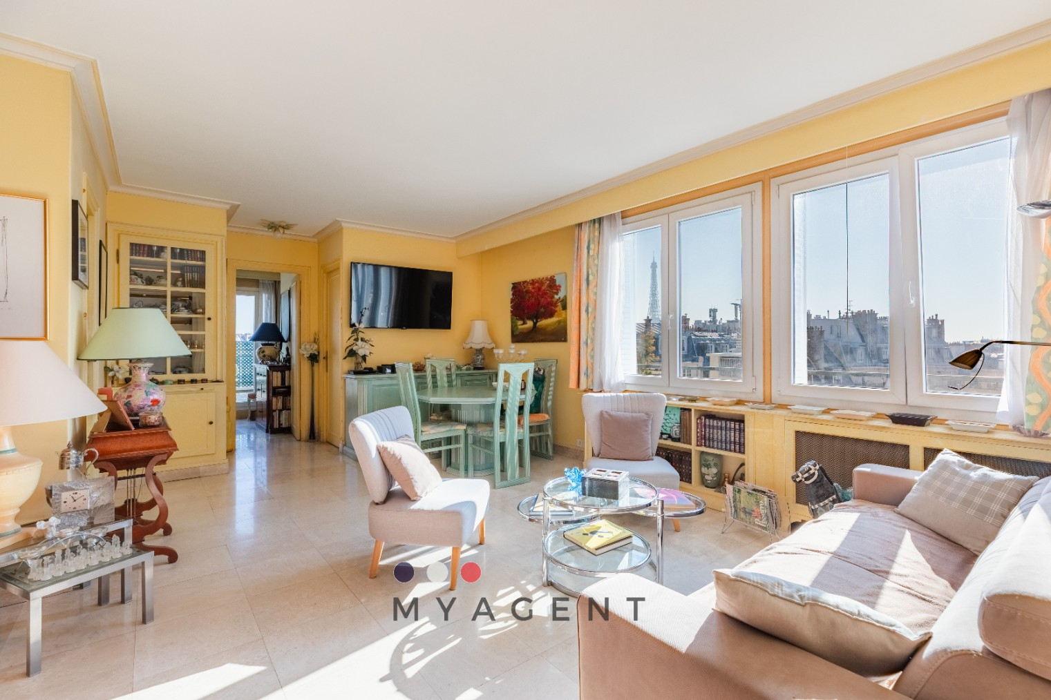 Dès l’entrée, le charme opère : une pièce de vie baignée de lumière, aux volumes généreux, orientée plein sud avec vue panoramique sur les toits de Paris et la Tour Eiffel. L’espace avec chambre parentale est prolongé par une superbe terrasse de plain-pied, idéale pour des moments ensoleillés ou des dîners face à la Dame de Fer.