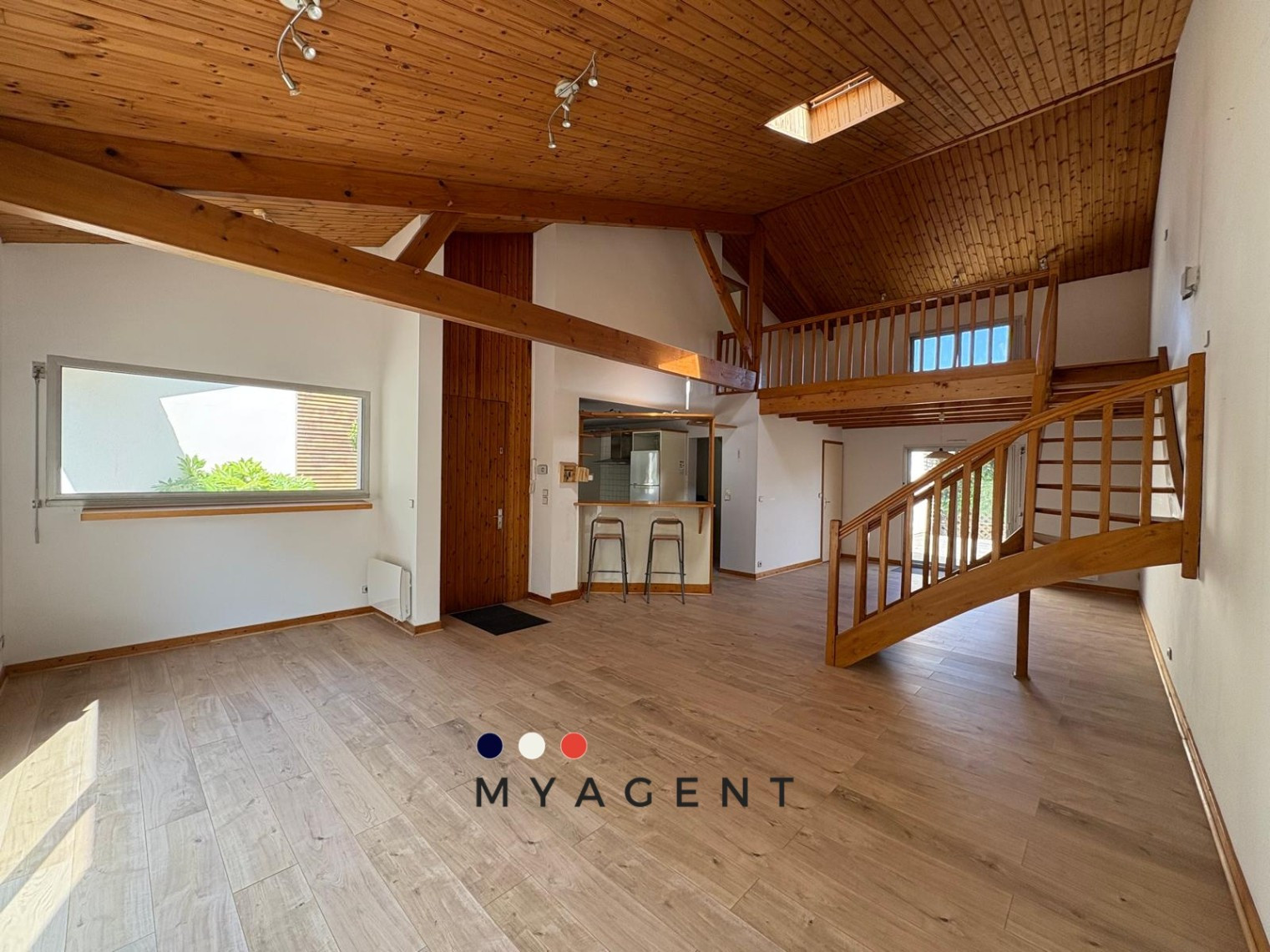 Un vaste séjour cathédrale d’environ 45 mètres carrés, baigné de lumière grâce aux grandes ouvertures et aux puits de lumière, avec plafond en bois et mezzanine.